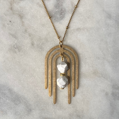The Subtle Body Necklace is a symbolic balance of form and energy. Three layered arches form the brass pendant, holding calming howlite stones at the center.